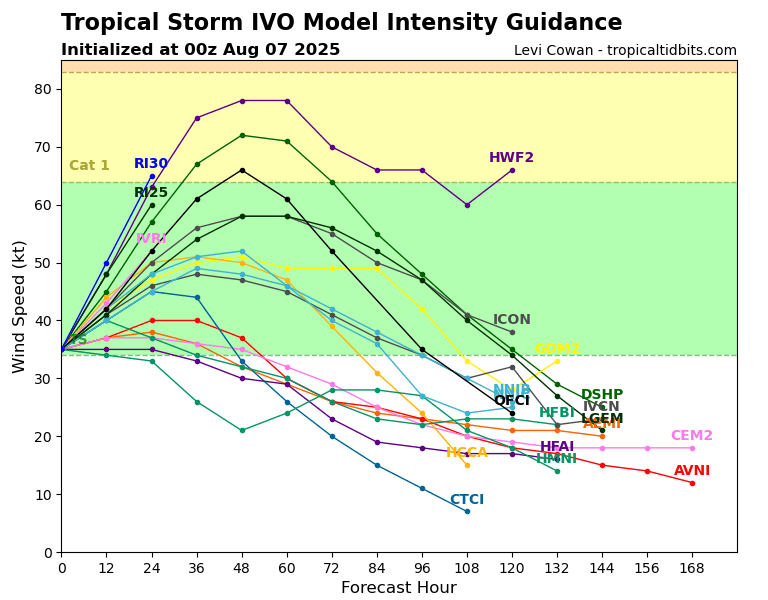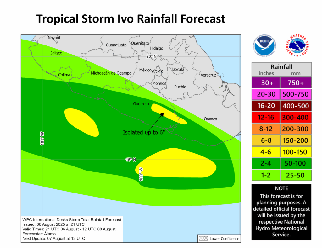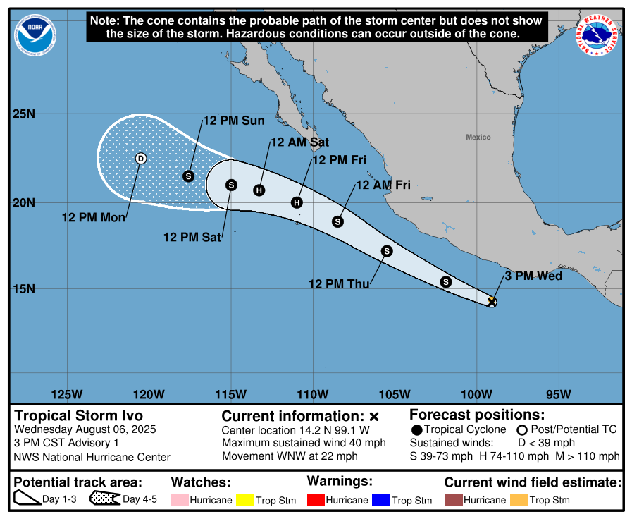 Tropical Storm Ivo currently has maximum sustained winds of 40 mph, moving west northwest at 22 mph. There is a lot of convection with the storm, and it is expected to strengthen in the coming days to a Category 1 Hurricane by Friday. The limiting factor for the storm not rapidly intensifying into a major hurricane is the high wind shear and stable environment it will travel into. While landfall is not expected, heavy rainfall and isolated tropical storm wind gusts are the likely impacts for the southwestern Mexican coast. Up to 6 inches locally could fall, which poses the threat for flooding and mudslides.