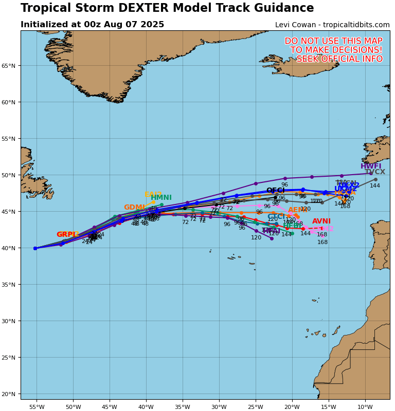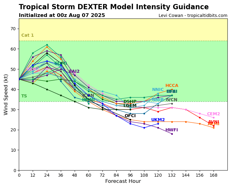 Tropical Storm Dexter is currently out in the open Atlantic, moving east-northeast at 16 mph with winds of 50 mph. It’s dealing with strong wind shear and starting to lose its organization from it’s center low. Dexter is expected increase it’s strength, though, to a weak Category 1 Hurricane by Friday. It’ll slowly weaken and linger into early next week as it stays out to sea. No threat to land is in the forecast.