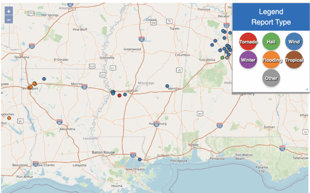 There were a handful of wind damage reports in the region. We also had a confirmed EF0 tornado in western Hinds County, just west of Jackson. Peak winds were estimated around 75 miles per hour, and it was on the ground for just under two miles. The damage was mainly to trees, many of them already weakened or dead, and there were no reports of structural damage.