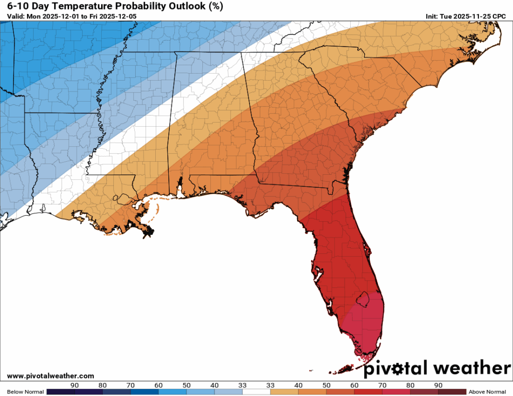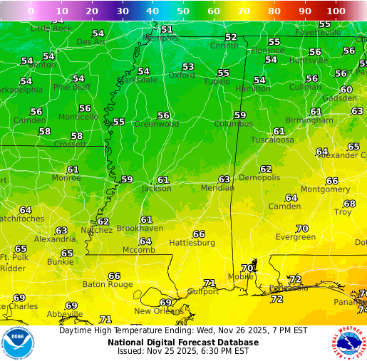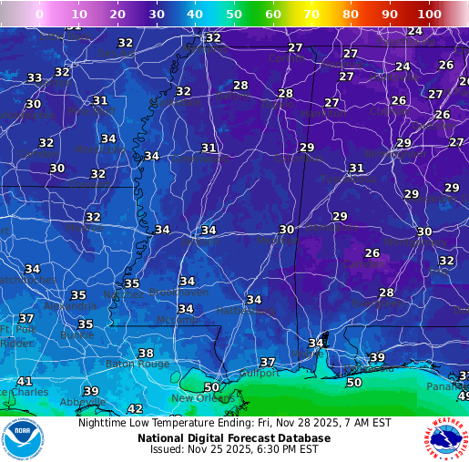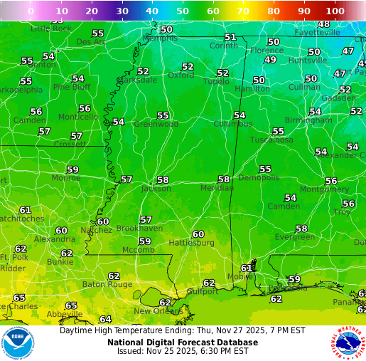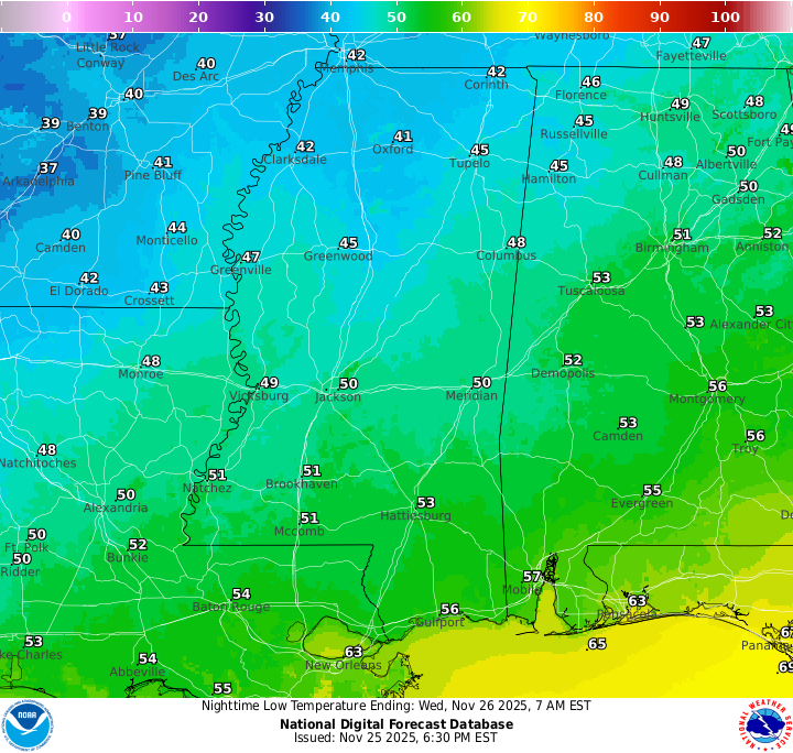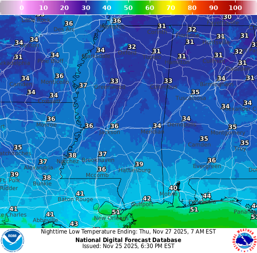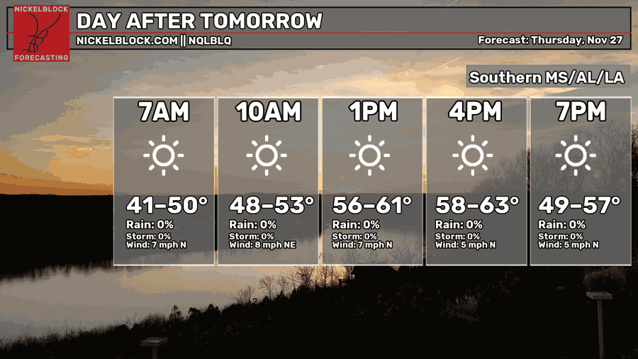 Thanksgiving Day is looking even better, but perhaps a bit cooler. Sunny skies will prevail for most of the day and we will stay dry. Overnight lows into Friday will be much chillier, with most of us seeing a low in the lower 30s. Check out those mid-to-upper 20s in northern MS and AL! Enjoy your meal!