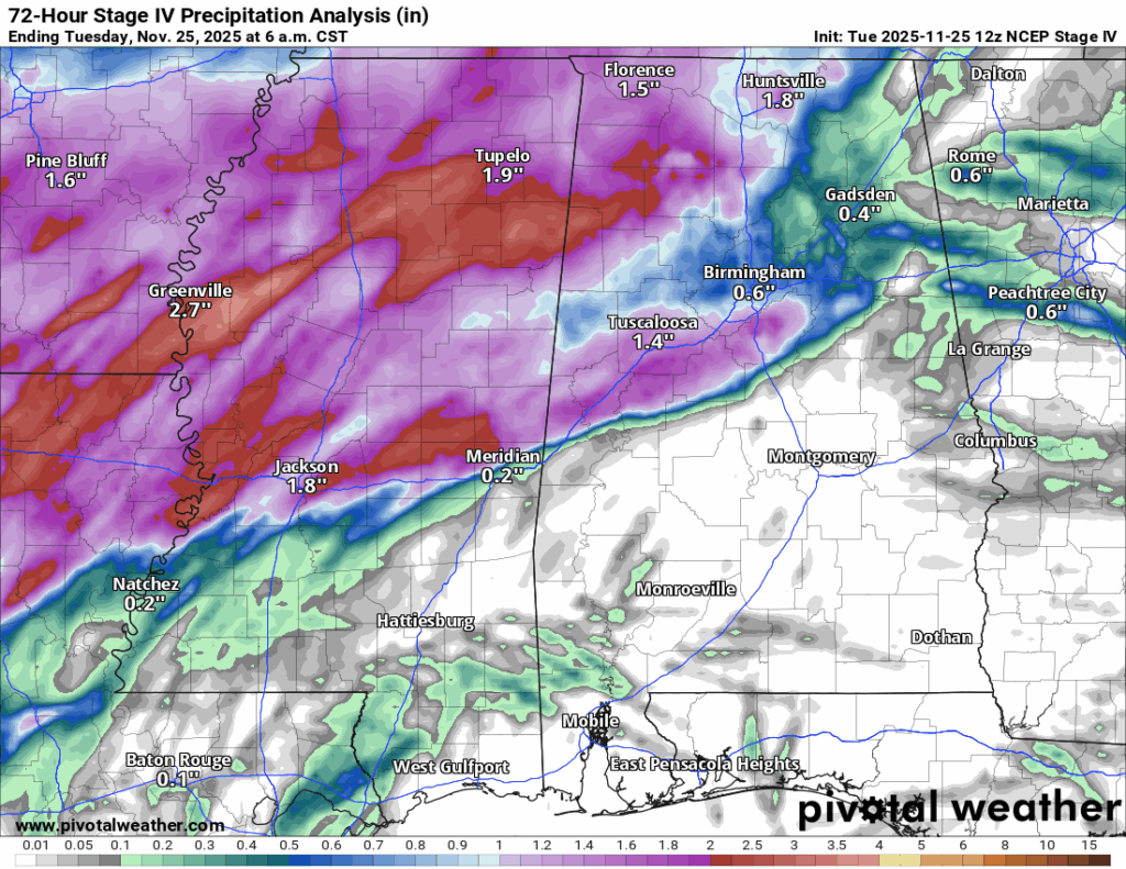 Last night’s storms really delivered for the northern half of the region. Most spots across central and northern Mississippi, northern Louisiana, and western Alabama picked up a solid one to three inches of rain. Farther south, amounts dropped off quite a bit, with much lighter totals across southern Mississippi, Alabama, and Louisiana.