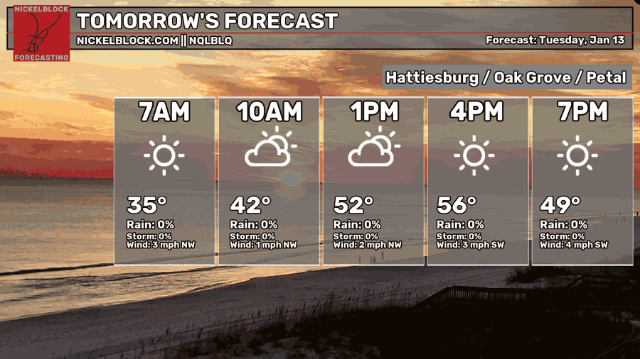Expect temperatures to fall around the freezing mark tonight. We’ll have a few clouds across the Pine Belt as the day progresses with temperatures in the mid-50s. Overnight, the low will fall into the mid 40s.