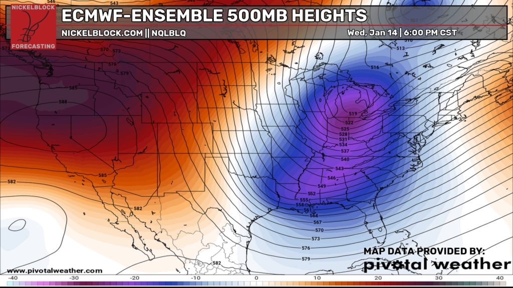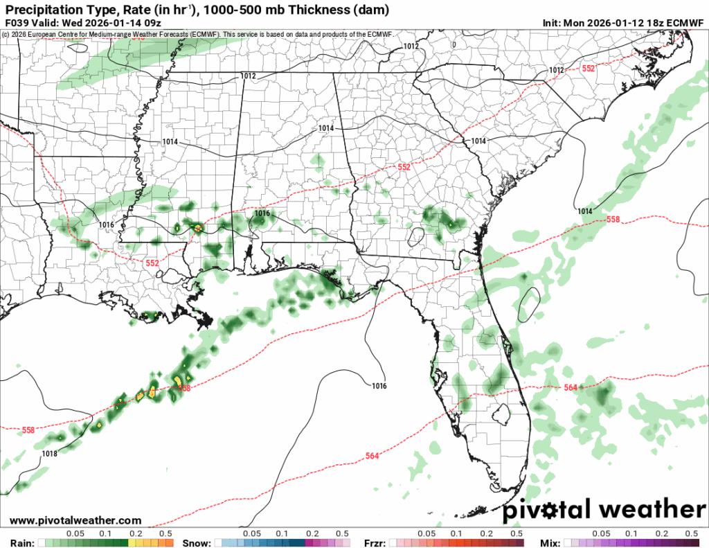 The Euro model above shows a large height fall/trough pattern developing over the middle of the week which will contribute to the cooler temperatures we are going to experience. At the surface, a low at the northern end of the Great Lakes will contribute to a slight chance of rain by mid-week. Afterwards, a growing high pressure system will build back in the Gulf to keep us dry.