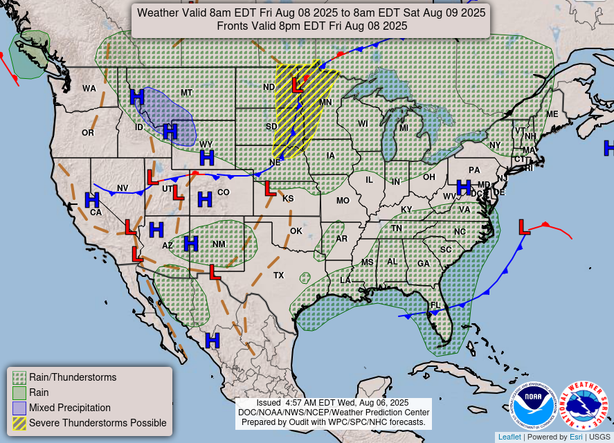 Tomorrow will be similar to today’s setup with a small cluster storms possible from the stationary front and some northerly influence. These storms are expected to start in the mid afternoon and last until after sunset. Highs in the 90s and lows in the mid 70s. Friday, however, we can expect some slimmer chances of rain as the high pressure zone moves in and dewpoints take a dive into the mid 60s and winds shift toward the east. This is some fairly good news, though as it’ll feel a bit drier. A few storms from the sea breeze are possible.