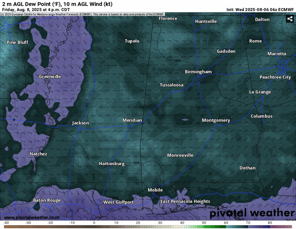 Saturday looks to be another drier one with a few sea breeze storms moving up, however the dewpoints are still a bit lower than usual. Expect highs in the low 90s and lows in the mid 70s. Sunday, however, will have a slightly higher chance for rain as the front I mentioned earlier will hang around a bit. Not only that, the developing high from the northeast will have a more east/southeasterly component which means that moisture flow is more present. It’s not huge, but it’s present over much of southeastern Mississippi and Alabama which is a decent indicator that rain is possible.