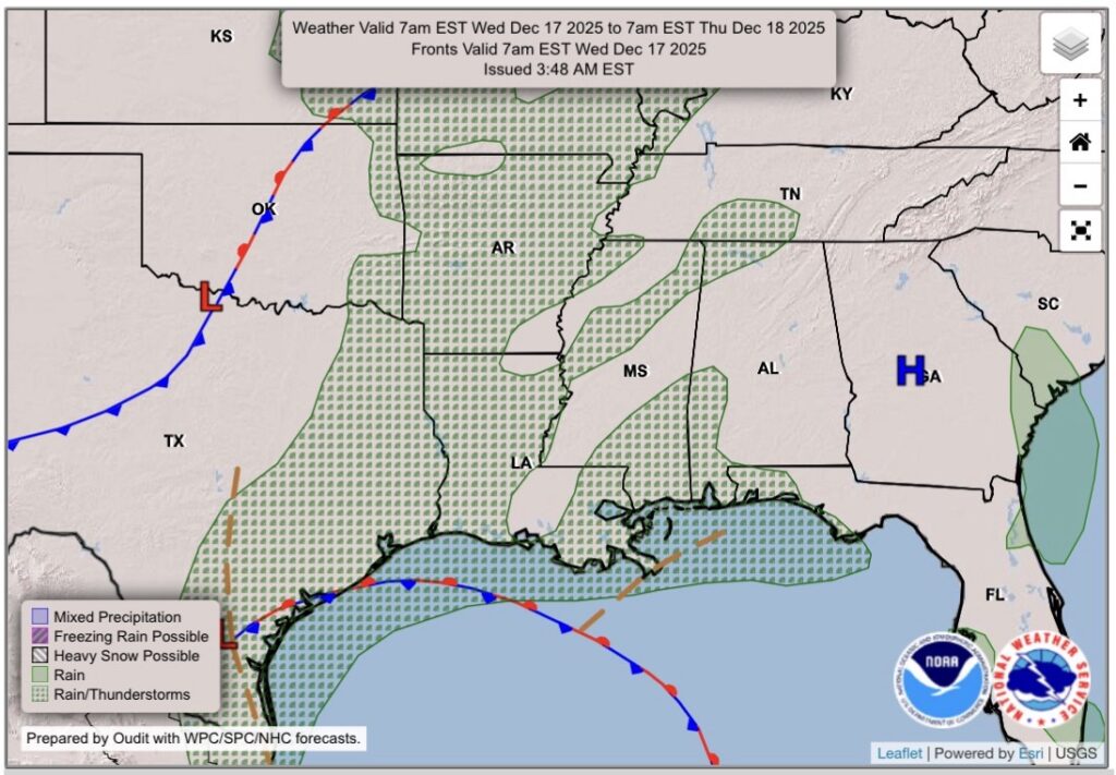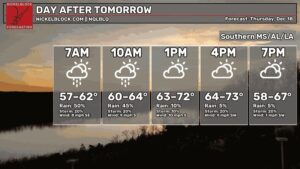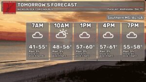 Our overall setup for tomorrow will feature a coastal low pressure system in the northwestern gulf that could bring some scattered showers and thunderstorms throughout the day. We’ll see more rain on Thursday from a cold front that will sweep through from the northwest.