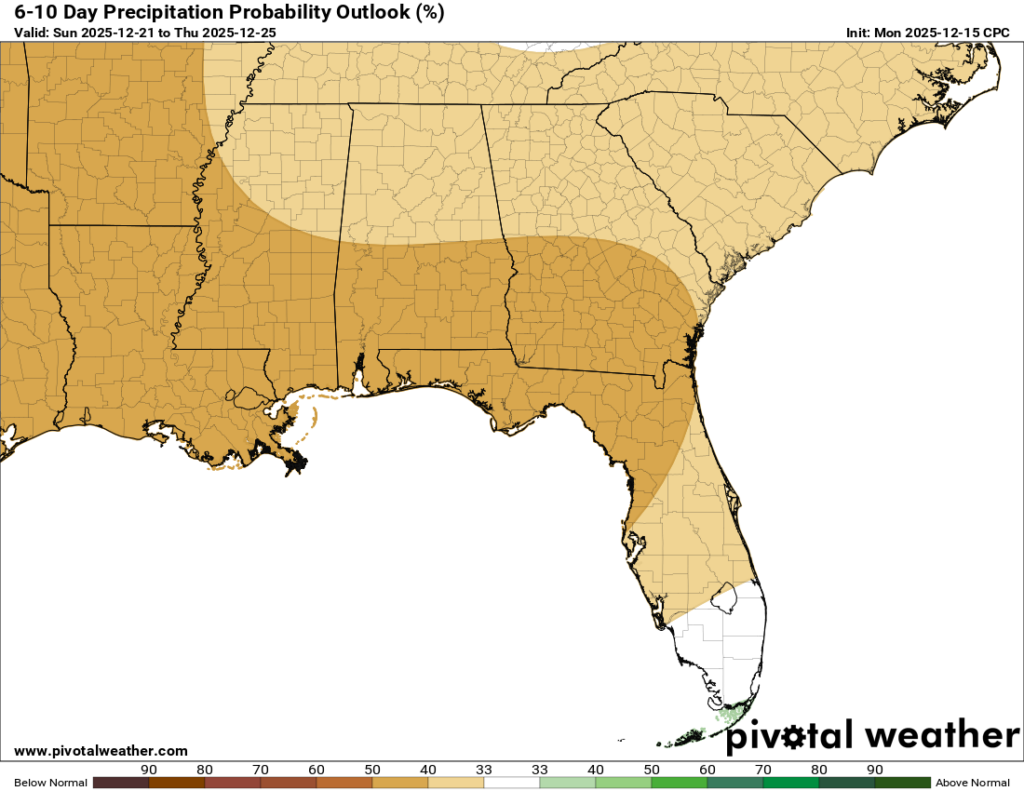 For the 6-10 day outlook, we can see that the CPC is agreeing with a warmer and drier pattern through Christmas, and even beyond that. While there are some shots of rain possible for Sunday and next week, it won’t be enough to be considered “average”, therefore we will have below average rainfall during that timeframe.