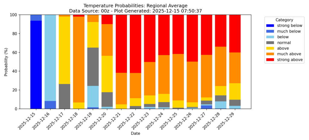 Hey everyone! The past few days, especially yesterday, have been very cold for our region. Good news if you’re not a fan of the cold – the ensembles are gaining confidence that a warm up starts Thursday. We should climb back to above average temperatures, with highs pushing into the 70s and likely staying there through the end of the year as a ridge builds in.