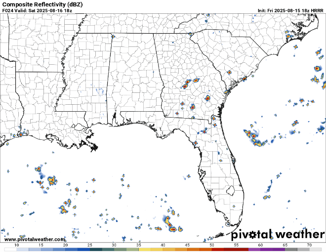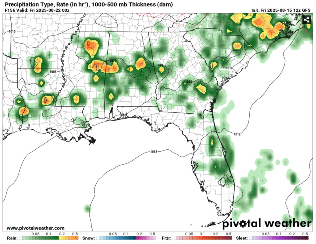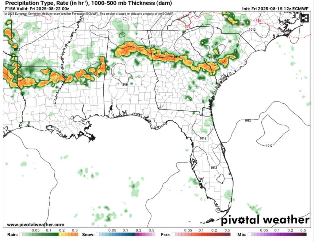 Monday through Wednesday will be afternoon thunderstorms across much of the states and remain in the mid to upper 90s. As we go into Thursday, a front will move into the mid-South providing some low level moisture to feed some incoming MCS storms. These will head south and may rain themselves out by the time they reach the I-20 corridor. As the front moves further south, however, we may likely see more rain during the day on Friday and into Saturday. The models are still a little spotty, but they’re in agreement that there will be more rain across the coastline and further inland.