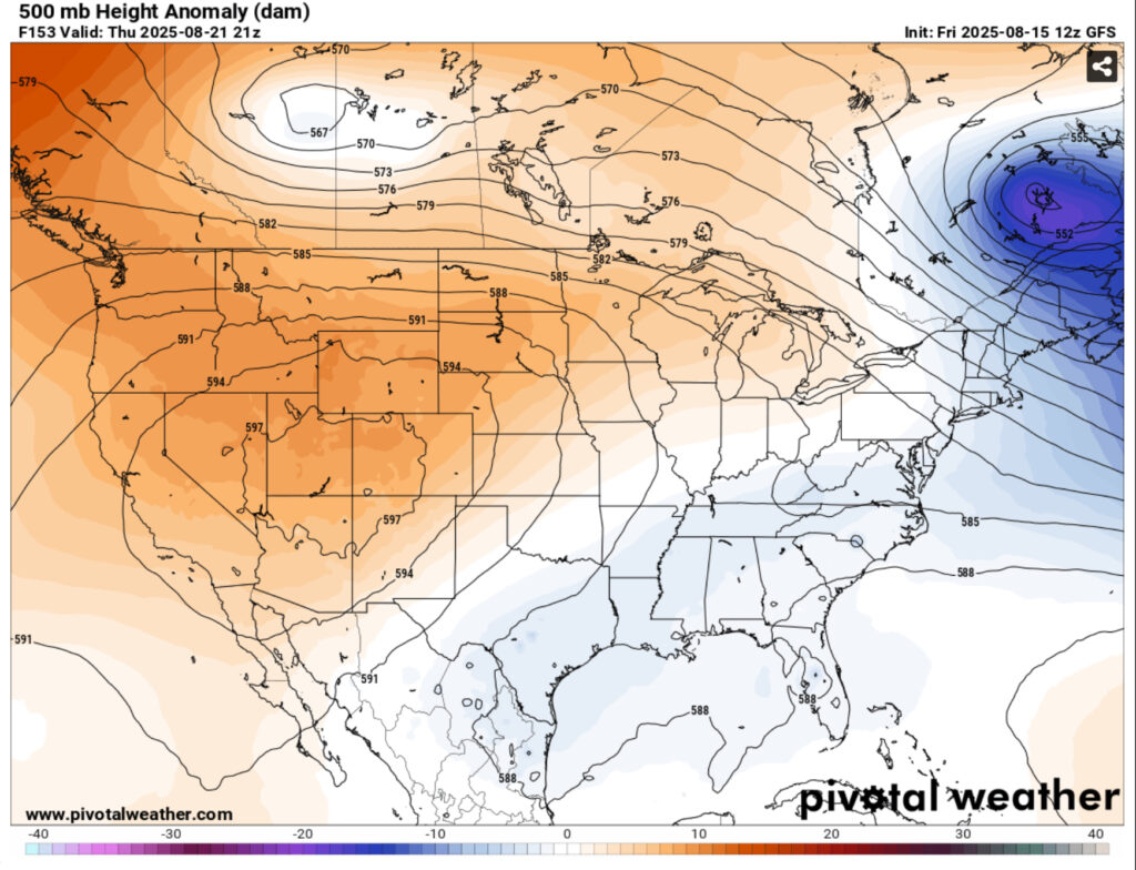 Looking at the upper levels, there is a large upper level ridge that expands across much of the central US. As the week progresses, Hurricane Erin will move up the North Atlantic and will eventually become an extratropical system. The ridge begins to retreat towards the western US and a trough will move in as the ridge builds, bringing some more northerly influence from above.