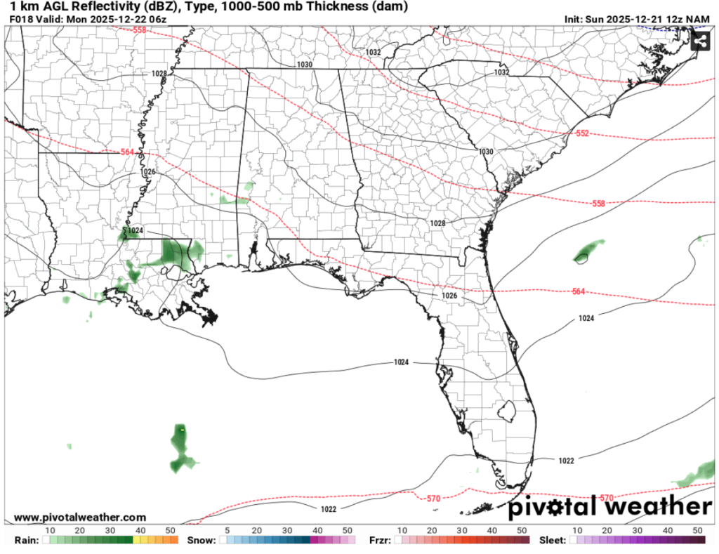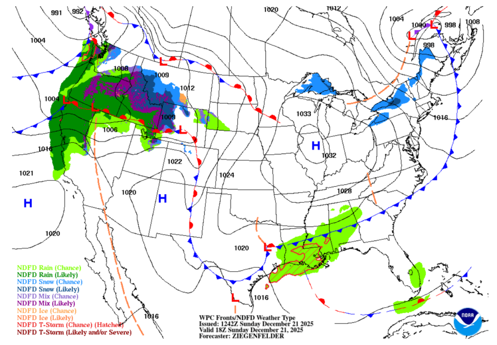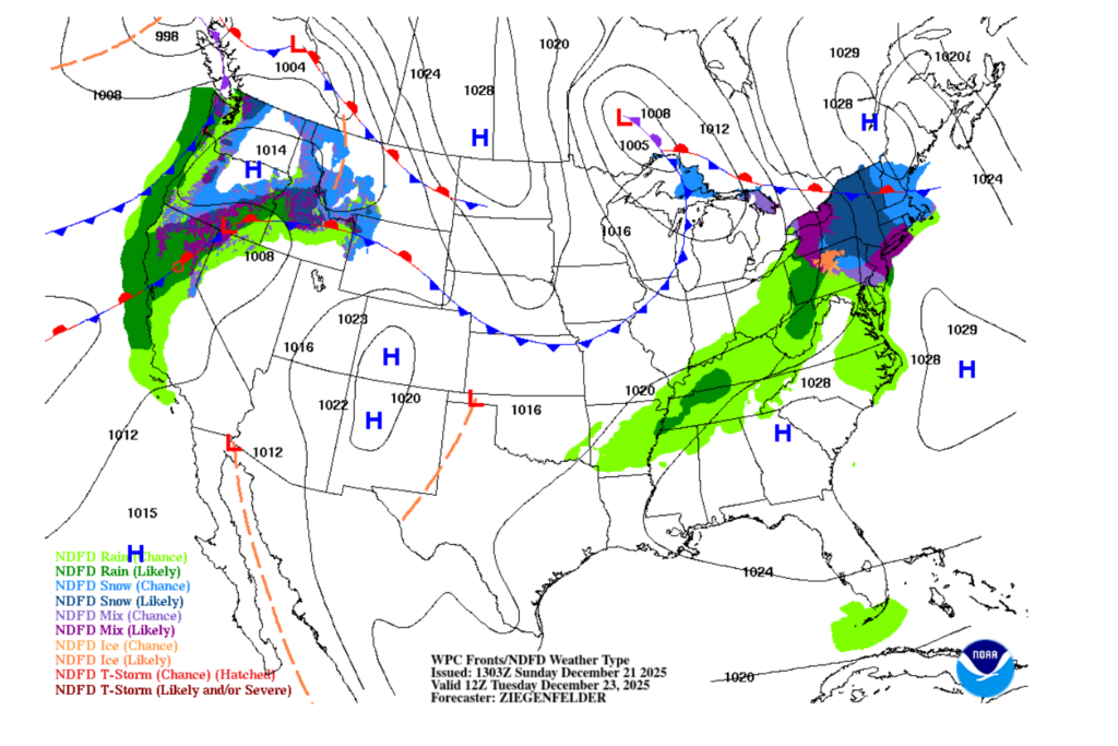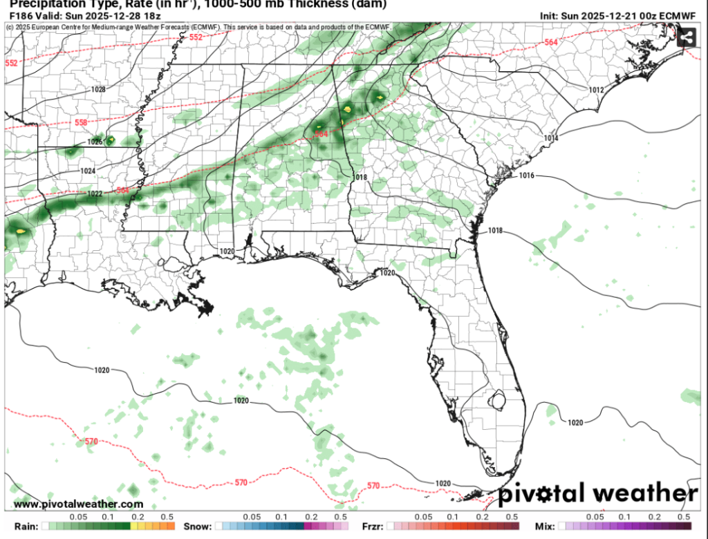 We are still looking at a warmer-than-average Christmas week, with high temperatures ranging from the mid-60s to mid-70s and low temperatures in the upper 50s to low-60s. There is not much variability in the high and low temperatures due to the moderating high-pressure system. High-pressure systems can be pesky and tend to stick around for a while, so the time frame for warmer temperatures not unusual!