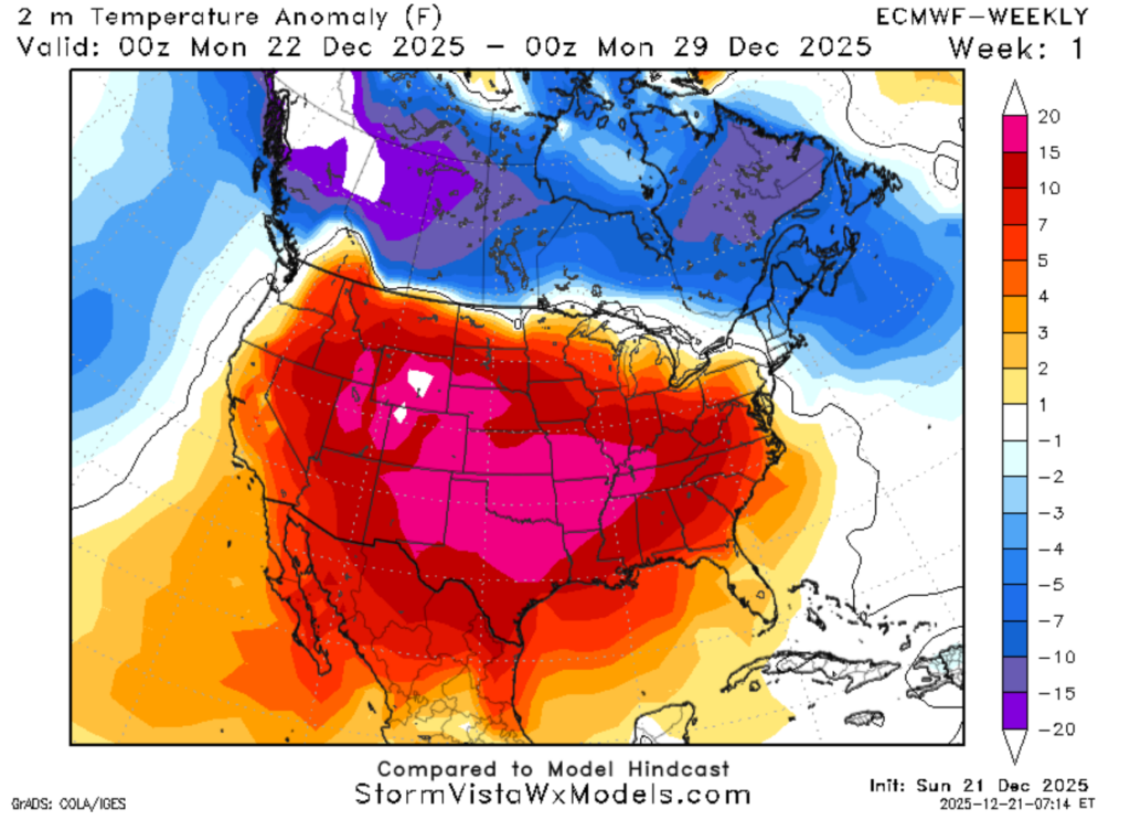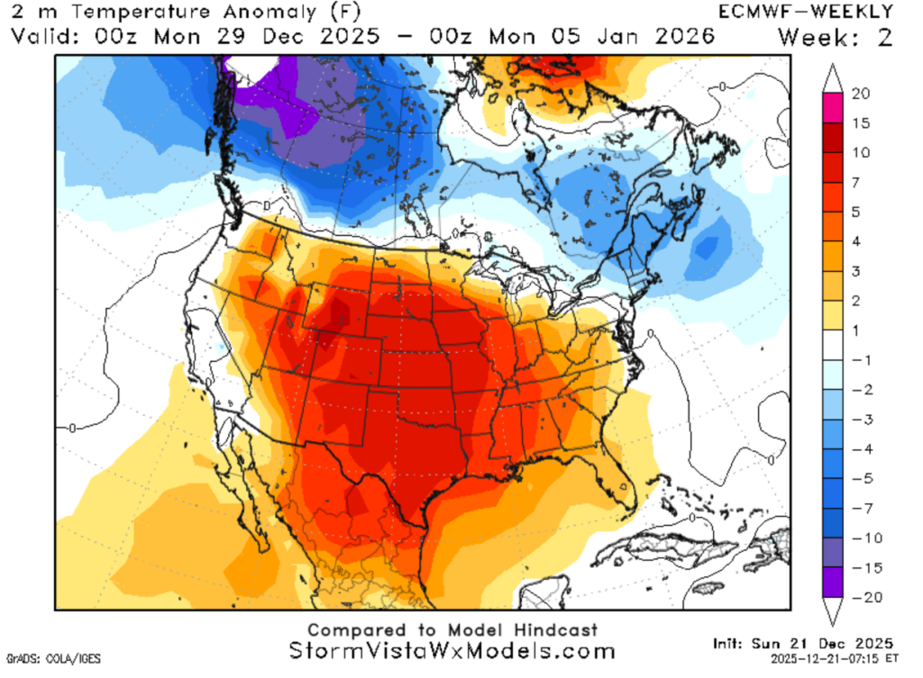 Now, these are temperature anomaly maps, meaning they are comparing the predicted temperatures for each week to the 30-year climatological average. So, instead of 15 degrees warmer than average like we are on Christmas week, we will only be 5-7 degrees warmer than average.