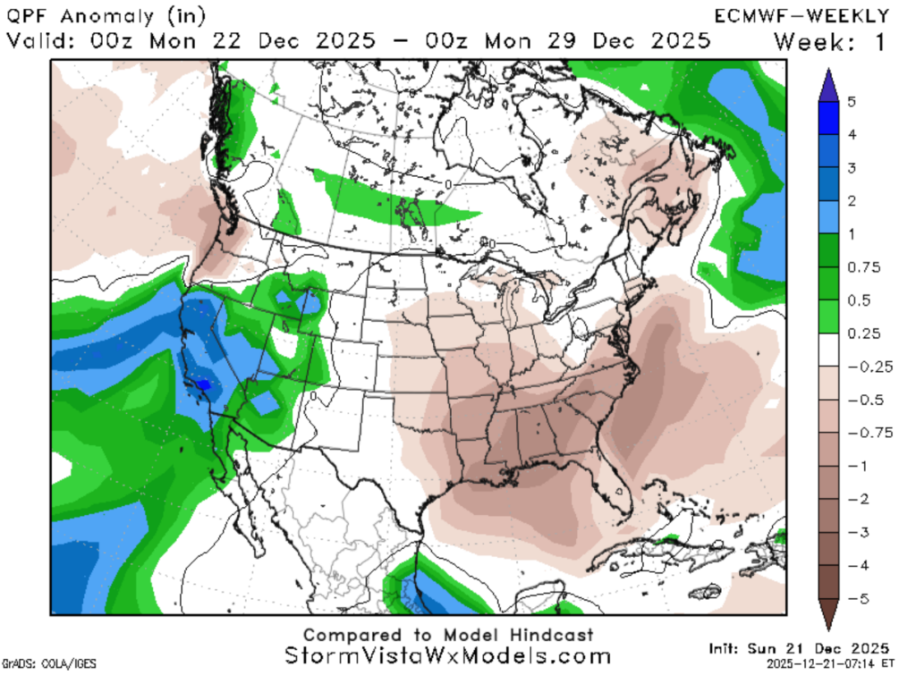 Looking at Christmas week, we are at -1 inch, meaning we will receive about an inch less of precipitation than the average. Looking at the next map, we are only -0.25 inches less than the average. Within this timeframe, December 29th to January 5th, we will likely be receiving more precipitation.