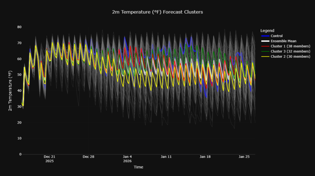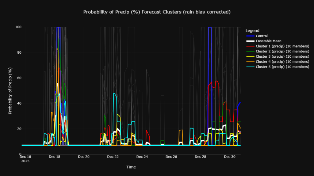 These plots can be confusing to look at, so let’s break it down. Looking at December 28th and beyond, we can see a lot of our clusters increase in the probability of precipitation. This means a large portion of the models used within the ensemble agree that there is a higher chance of precipitation during this time.