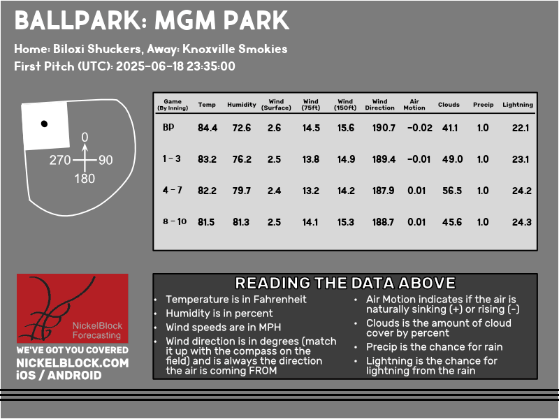 Wednesday’s game against the Smokies will take place at 6:35pm CDT. Temperatures will be in the low-80s with partly cloudy skies as we see some showers to the south. Humidity will be around 80% with calm surface winds. Up at 150ft the winds will be around 15 mph pointing towards the left field foul line coming off the water. With a bit of sun in the evening, there will be some glare for the outfields for this game and it will be quite hot and humid.
