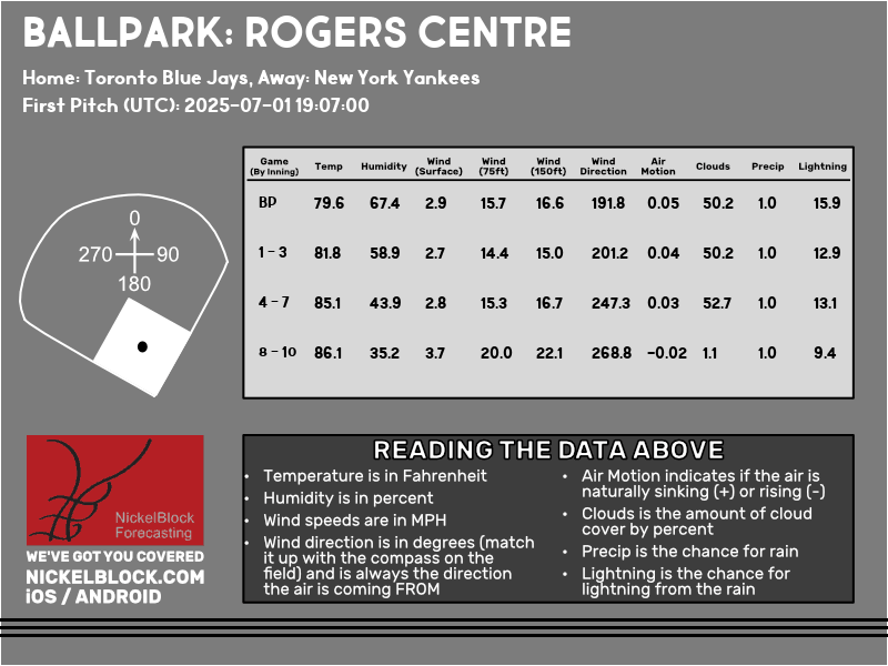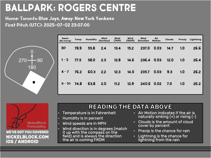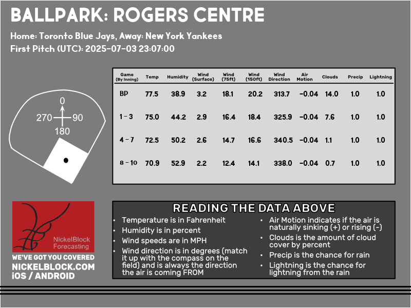 Wednesday night’s game against the Blue Jays takes place at 7:07pm EDT. Temperatures will be in the mid-70s with humidity around 60%. Cloud coverage will be minimal with showers in the region but none in our exact area. Winds will be around 14 mph at 150ft with calm surface winds. These winds will be pointing towards right field which will be helpful to batters getting those fly balls an extra inch. Overall, a very nice night for players and spectators alike!