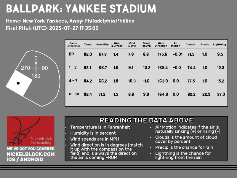 The Yankees conclude their home series against the Phillies at 1:35pm EDT on Sunday. Temperatures will be in the low-80s with mostly cloudy skies. Humidity will be around 65-70% with calm surface winds. Winds will be pointing towards left field at around 10 mph at 150ft. There will be some showers moving into the later afternoon, none should effect the game, but may effect people’s commutes back home after the game.