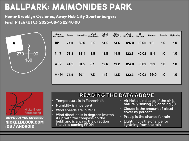 On Saturday night at 6pm EDT, the Cyclones continue their home series against the Spartanburgers. Temperatures will be in the mid-70s but with high humidity, around 75-85% that will still make the air feel warm and sticky. It will be a clear night with surface winds around 6 mph with winds at 150ft around 11 mph. Winds will be blowing towards the infield which will make it harder to hit a home run and fly balls will be pushed around 38 feet back. The Cyclones have one of the hardest stadiums in the minor league to hit a home run because of these stronger winds that come off the shore. For spectators, it will be a fairly nice night!