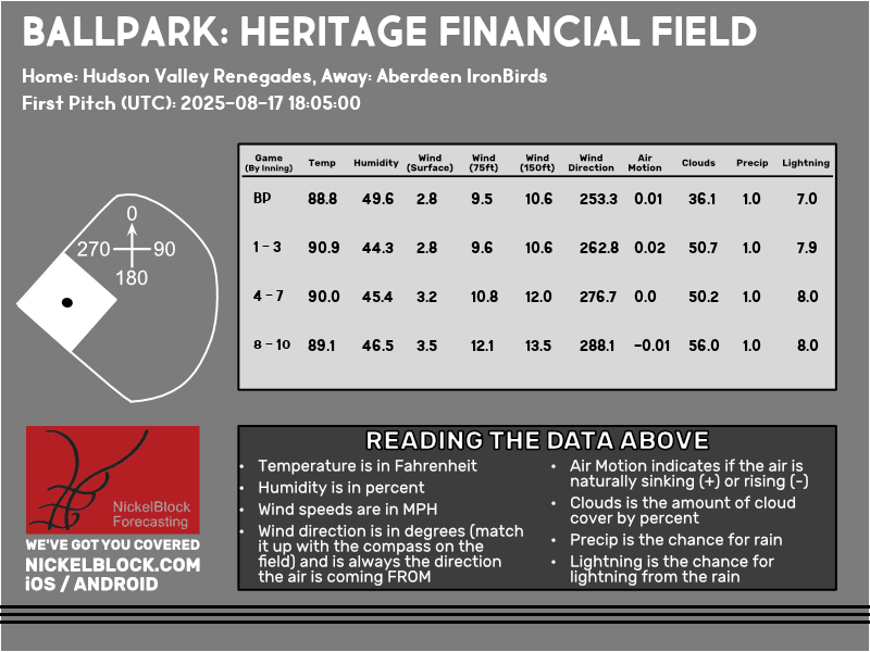 Sunday afternoon’s 2:05pm EDT game against the IronBirds will be at home for the Renegades and will finish out their series. It will be a hot afternoon with partly cloudy skies, which means a good amount of sunlight beating down on the stadium. Temperatures will be at their peak, around 90 degrees with humidity around 45%. Surface winds will be calm and at 150ft, winds will be around 12 mph blowing towards center field. This will greatly help all batters and give them almost 38 feet of help with getting fly balls further in the outfield. This means we could see a 10% chance of more than 1 home run this game as the Renegades average around 1 home run per game. It will be hot which will make players feel a bit weak still but it will likely affect pitchers more and they will likely last not as many innings. It will be crucial for players and spectators to hydrate and take breaks.