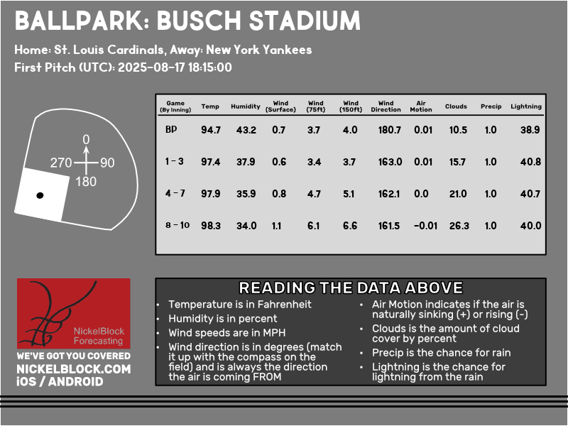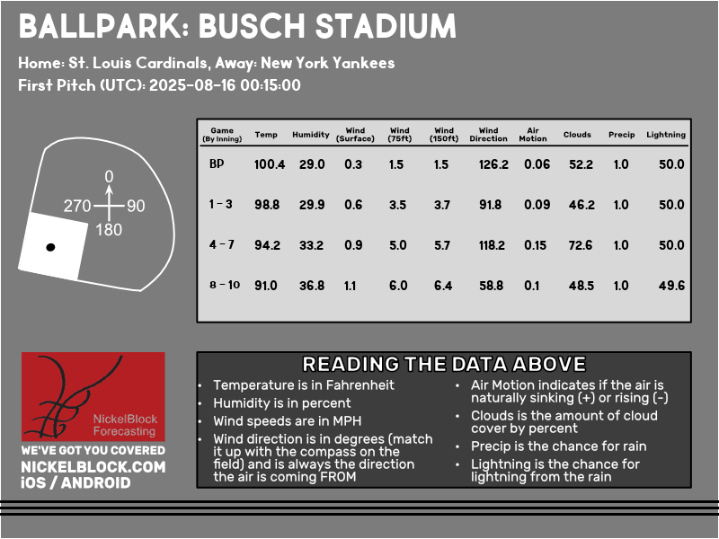 The Yankees start an away series against the St. Louis Cardinals at 7:15pm CDT tonight. It will be a scorcher, with a heat advisory in the area. Temperatures will be around 100 degrees during batting practice and will cool to only 90 degrees by the end of the game. It will be mostly cloudy which will help keep the sun at bay while it’s out for the first few innings. Humidity will be around 30-35% which won’t make it feel sticky on the already hot temperatures. There will be almost no winds and air motion will be naturally sinking quite a bit. Players will already be feeling weaker with the super hot temperatures so it would be possible to see below average runs from both teams. We will also likely see pitchers last only a few innings at best because of the heat. It will be super important for people to hydrate and stay cool for this game as this type of heat is quite dangerous when being outside.
