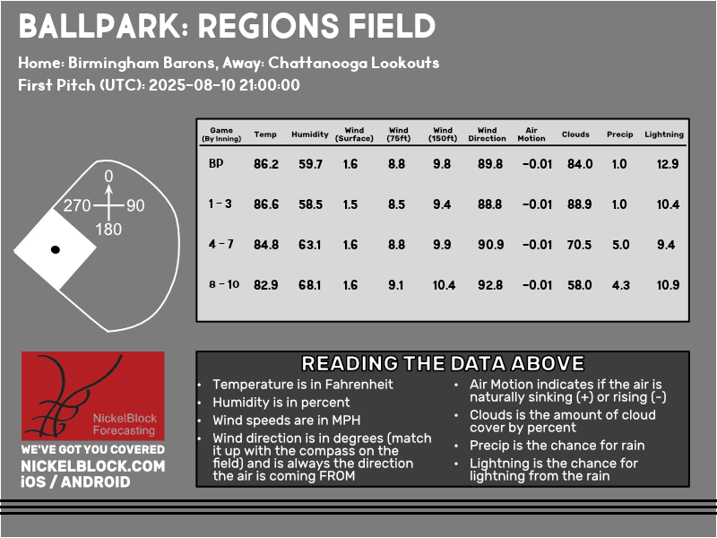 The Barons close out their series against the Lookouts at 4pm on Sunday. Temperatures will be in the mid to low-80s with humidity around 60-70%. We will see cloudy skies for most of the game with calm surface winds. The major weather factor will be the winds at 150ft that will be around 10 mph blowing towards the infield. This will make the ball miss a home run by around 38 feet (19 feet per 5 mph of wind). Air motion is only slightly rising so that may make that 38 feet slightly less but not enough to avoid that effect in general. Be onboard the watch for some shorter fly balls this game as we see those winds go against the hitters.