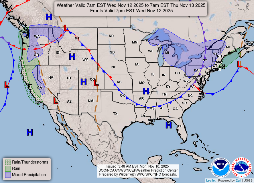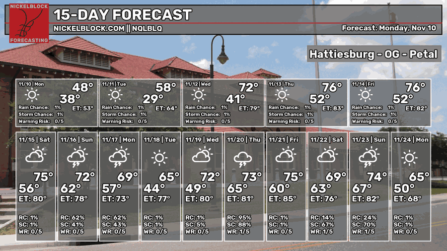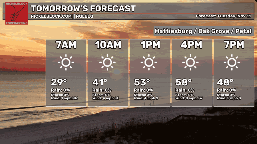 It’s been quite brisk and chilly outside with the cold front coming in! Winds are out of the north and the high pressure system will move in not long after tonight. We’ll fall below the freezing mark tonight, so be sure to cover sensitive plants and bring your pets inside. Veterans Day will be another cooler day with the winds calming down but highs in the mid 50s and lows in the mid 30s.
