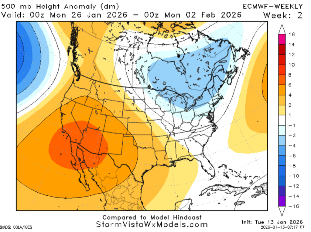 Yep! A ridging environment helps to moderate the temperatures by making conditions warmer during the winter. Almost all the long-range models agree that we will be in this slight ridging environment for this time period. The only difference between models is the strength of the ridge.
