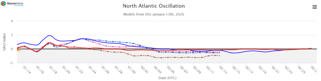Looking at the NAO from January 28th and beyond, it starts slightly positive and then becomes pretty much neutral or slightly negative. This means we will start a little warmer than usual and then fall back to near average or slightly below average by February 1st.