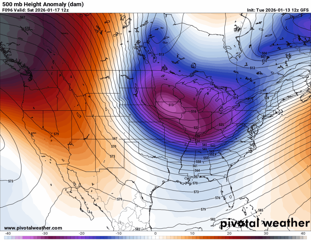 If you were curious as to why we keep getting these cold air shots, this is the 500mb anomaly for Saturday, and this pattern continues until Wednesday. This upper atmospheric setup of this large trough sitting to the north leads to these chilly temperatures we will receive.