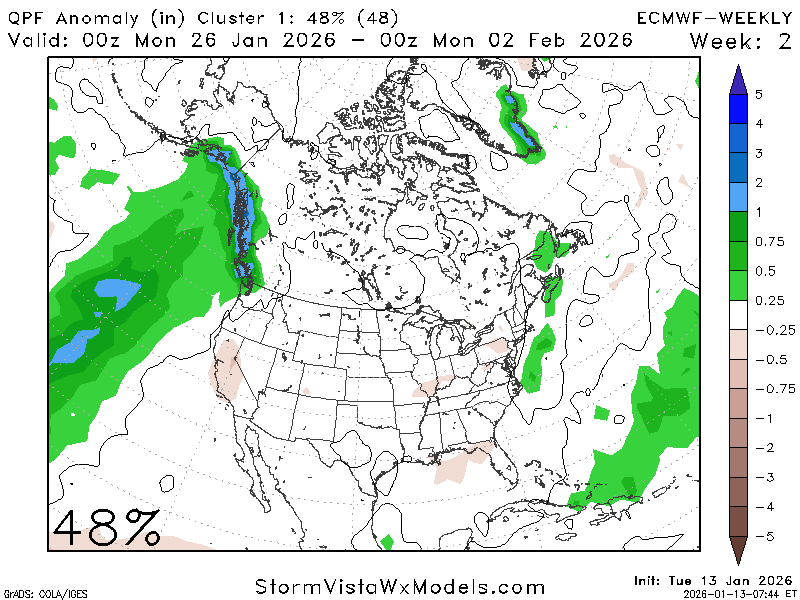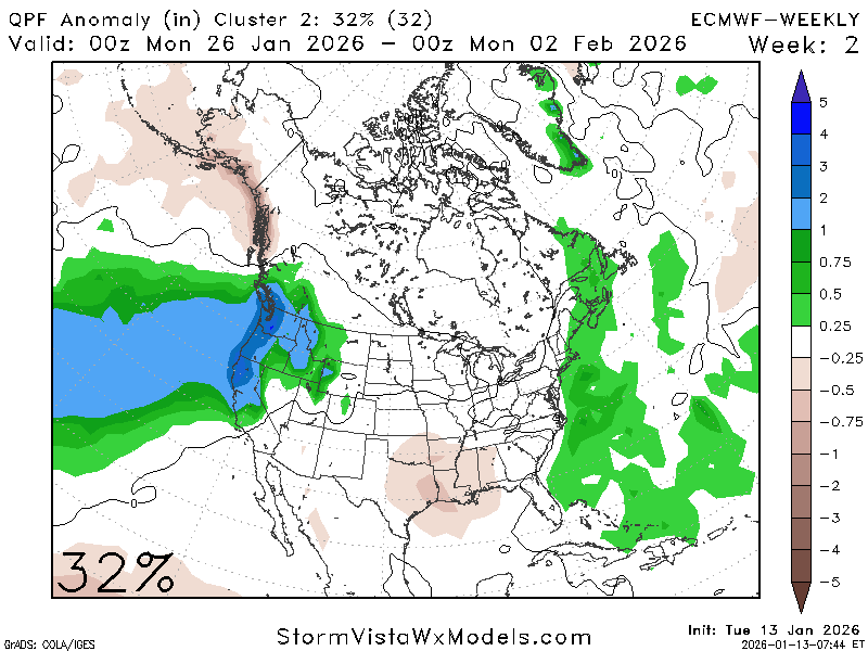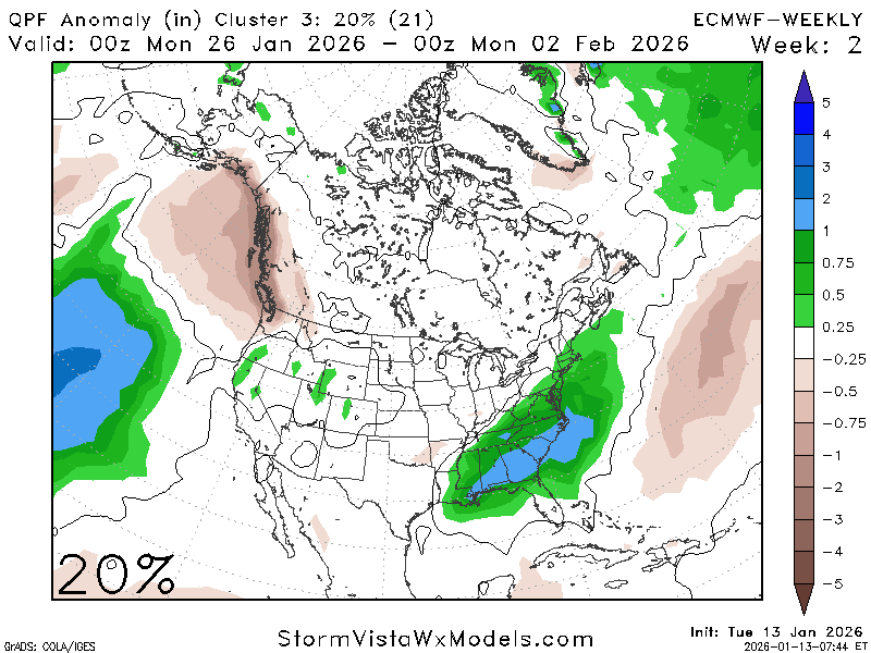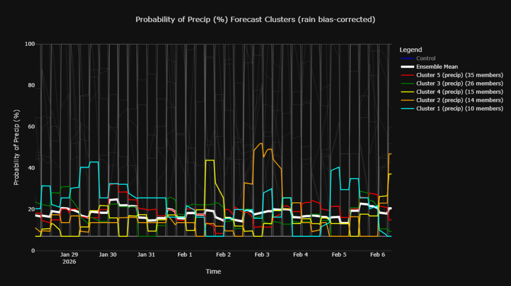 The ensemble cluster for precipitation agrees with the ECMWF weekly; there are average chances for precipitation during this period, with no abnormal spikes or lulls.