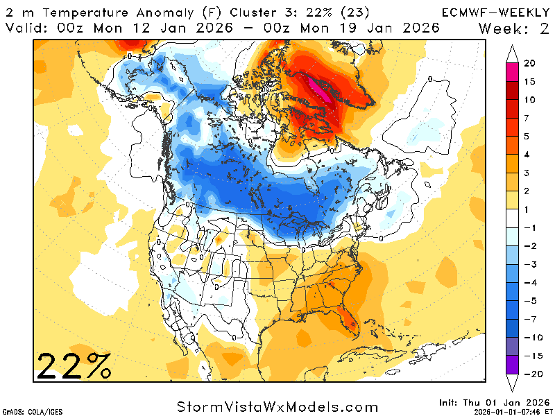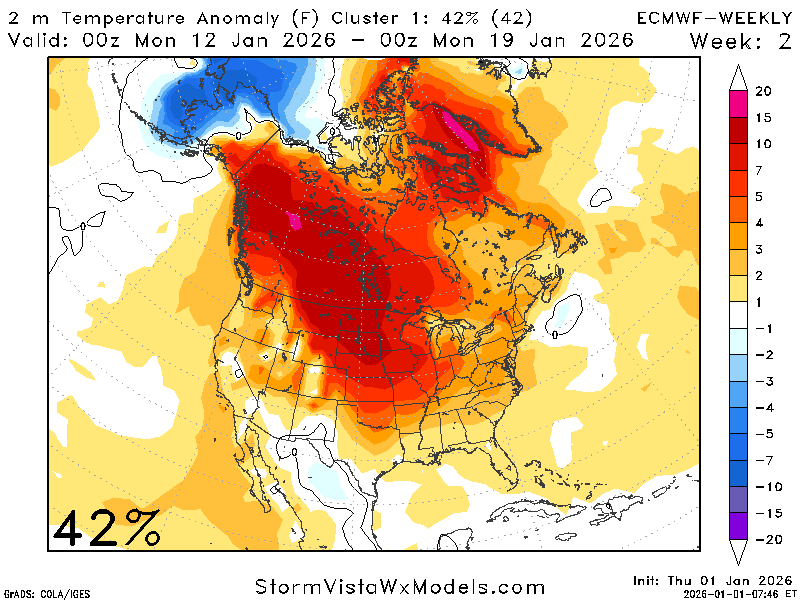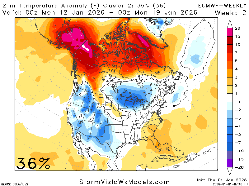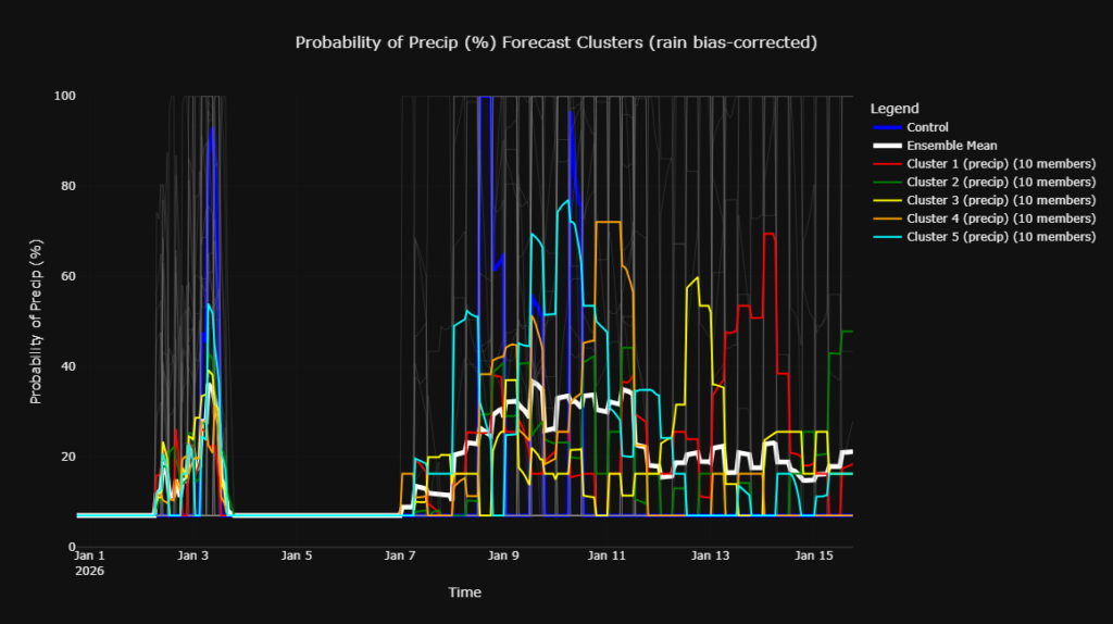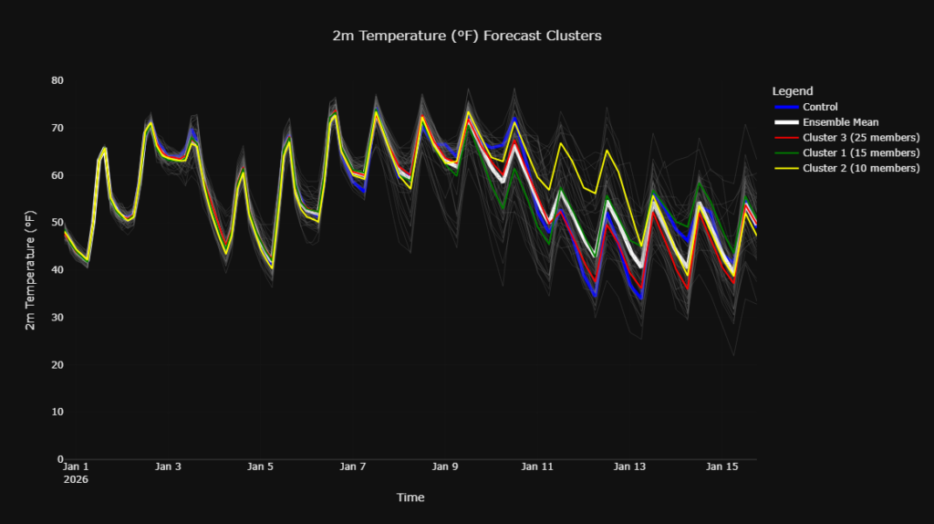 A quick look at the clusters for this period also indicates increased precipitation chances and variable temperatures. The temperature cluster clearly depicts the range of possible outcomes. Around January 11th, we can see there are some members showing 60 degrees and other showing 35 degrees.