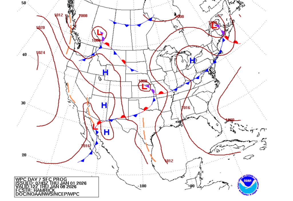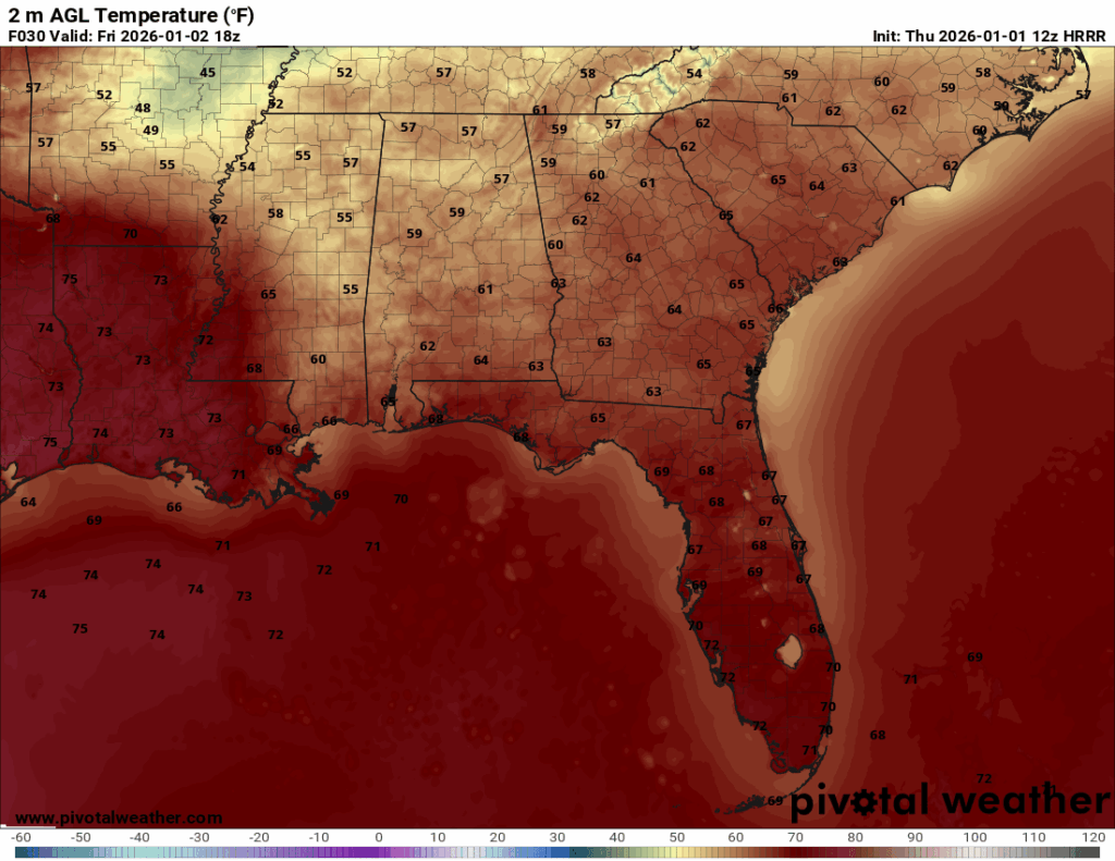 Looking at the temperature map for Friday, it shows that the warm sector pretty well! That harsh line dividing the 70-degree temperatures from the 50 to 60-degree temperatures is the boundary.