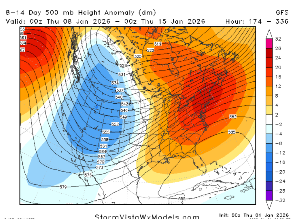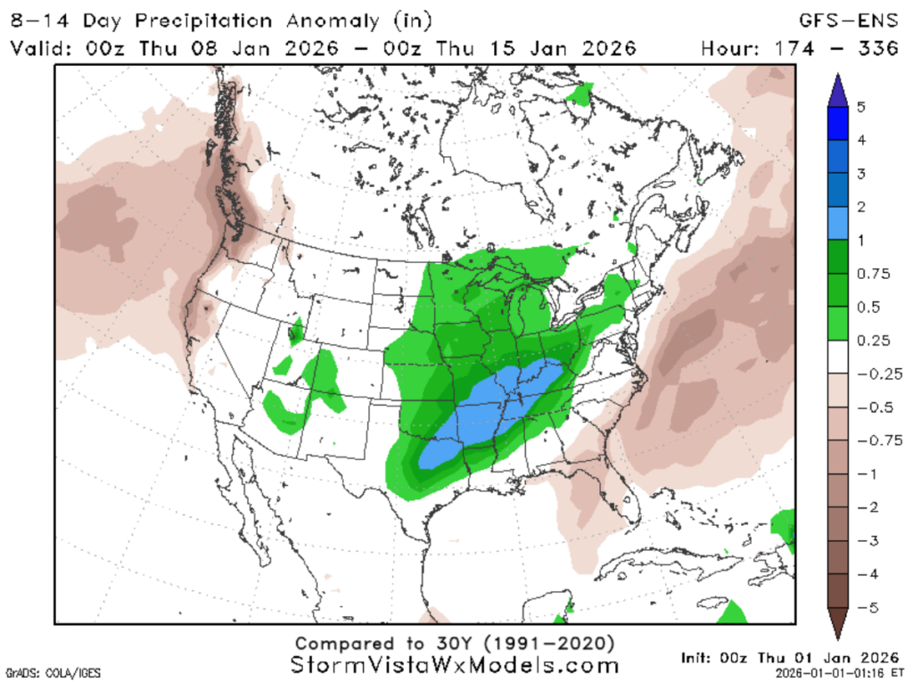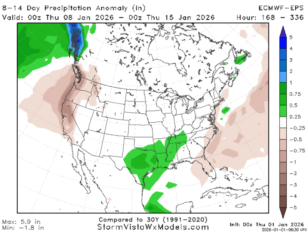 In summary, for the timeframe of January 8th through the 15th, expect warmer-than-average temperatures with higher-than-normal chances of precipitation, but do not rule out any shots of cold air. These variable temperature conditions and precipitation chances are due to the atmosphere moving into a trough-like pattern.