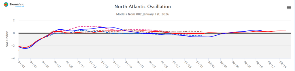 Looking at the NAO to help solidify this pattern, it is neutral to slightly positive, indicating temperatures near the seasonal average.
