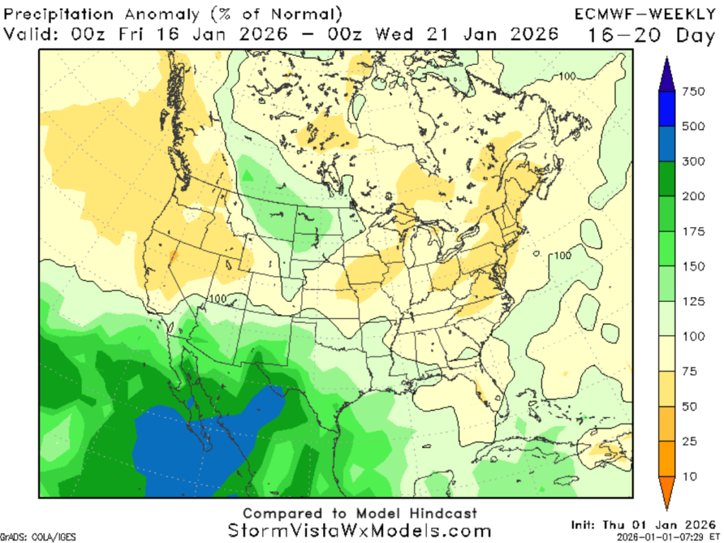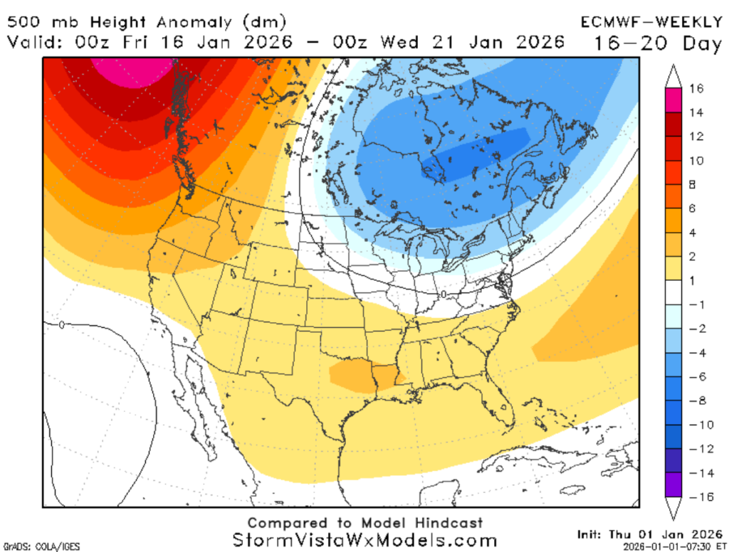 In brief, for January 15th and beyond, expect temperatures near or slightly warmer-than-average, with average precipitation chances. However, there is a prominent trough located to the north, so occasional cold intrusions cannot be ruled out.