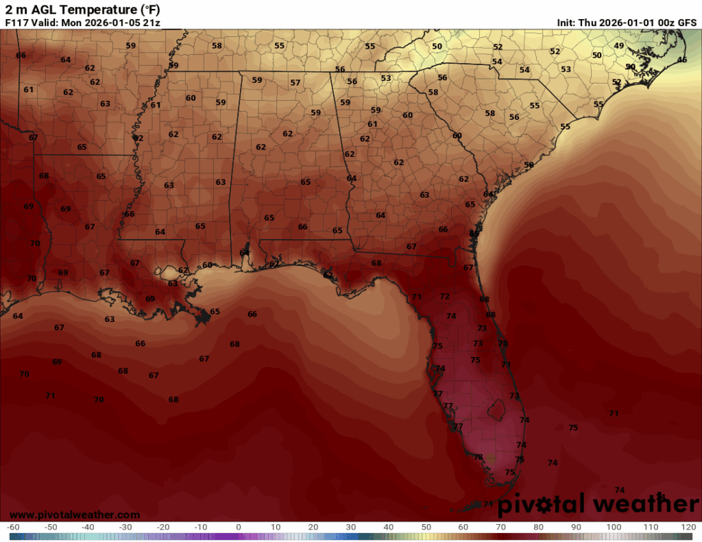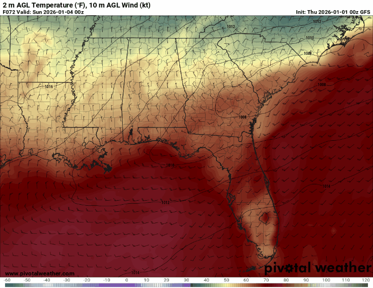 By Monday, the winds shift to southerly, and the Gulf gives us a nice warm up.