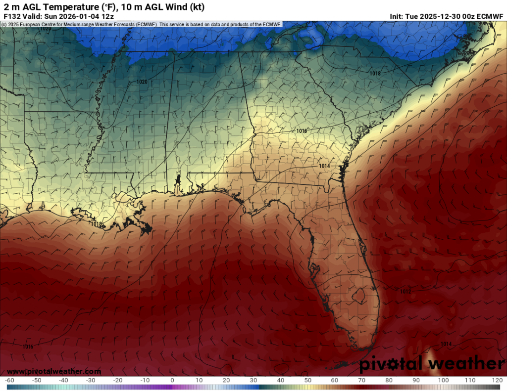 The primary driver for these warm temperatures and lack of variability is due to the shift in the wind. The wind flow will shift from northerly on Sunday to southerly by Monday. A southerly flow brings that warm, moist, Gulf air into our region and moderates the temperatures.
