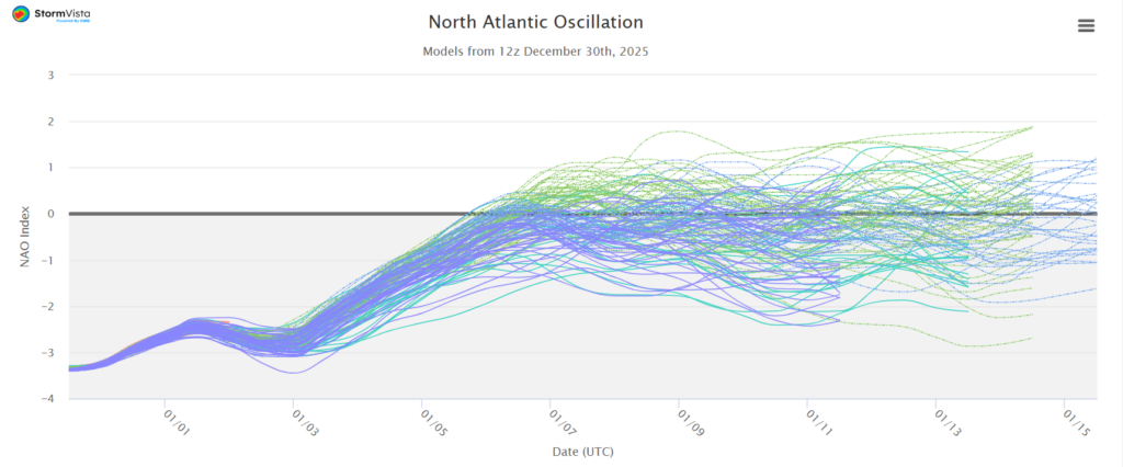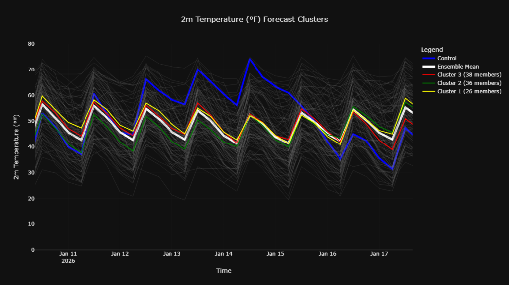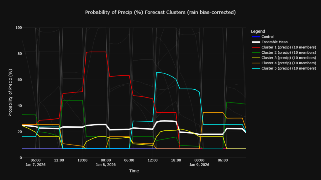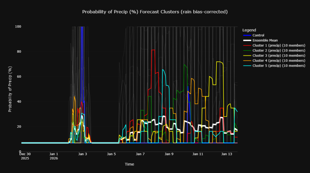 We can see a spike in the majority of members on January 3rd, associated with the front, followed by another increase in members around January 8th. Where a large number of the members increase, indicating a higher-than-normal probability of precipitation.