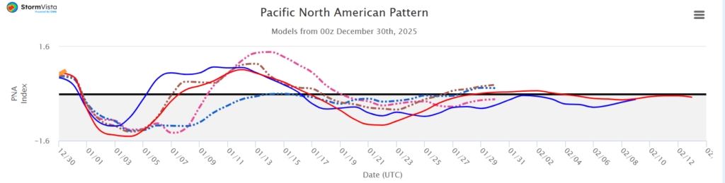 The PNA is trending positive, which leans toward cooler conditions.