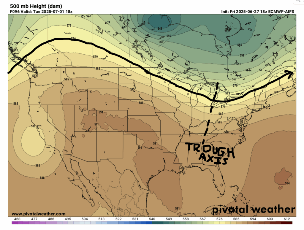 After the current ridge that we’ve been under flattens out, a shortwave trough will begin to form over us early next week, bringing more wet weather that may be a bit more prolonged. A stationary front is also forecast to park itself over by our area, keeping the wet weather here for a while. This means that we may be seeing more storms throughout the entire day, not just in the afternoon.