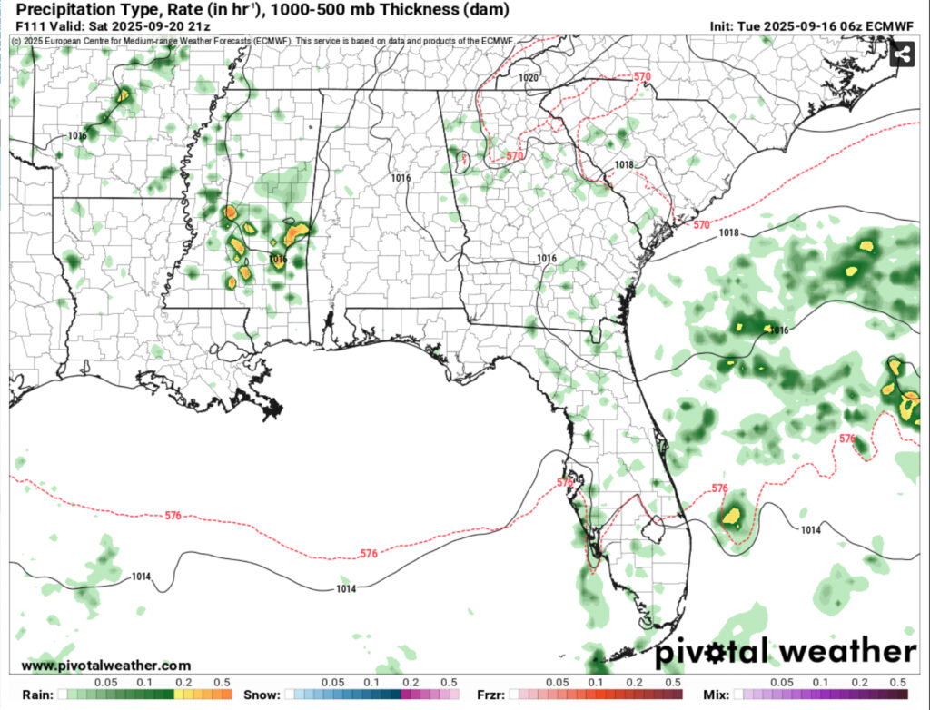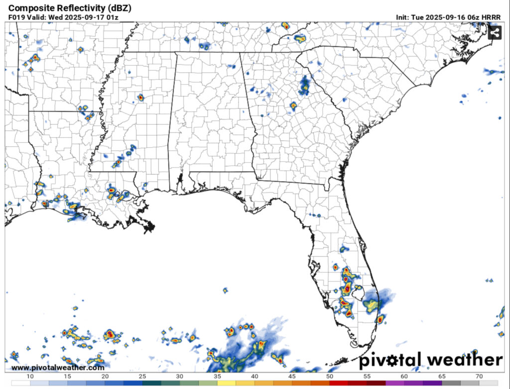 I should also preface this to say that it’s a very small chance. Due to the northerly winds in the upper levels, a few small cells will work their way down from northern Mississippi to the south and spread out a bit. Expect a few isolated thunderstorms across the central and southern portions of Mississippi and possibly even Louisiana this afternoon into the evening.