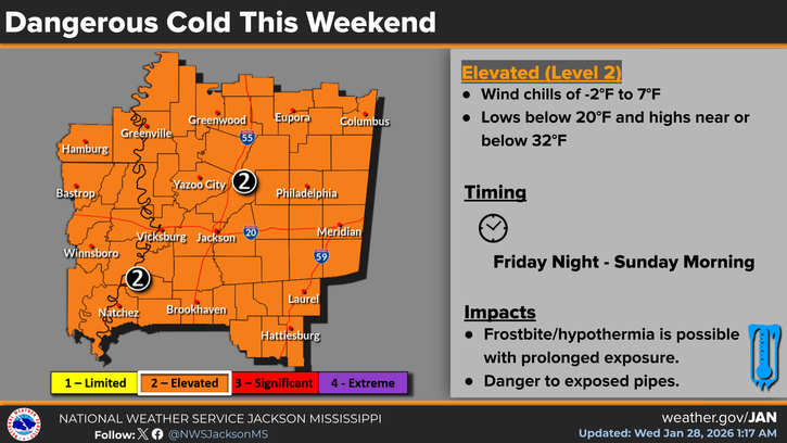 The NWS in Jackson has already highlighted a dangerous cold outlook for this weekend. Many of us south of I-20 will have highs just above the freezing mark while many above will stay below freezing. It’s going to be very cold, so make sure everything is wrapped, faucets are dripping and pets and plants are taken care of. Wind chills will be in the 10s day and night, so it’s going to be dangerously cold for anyone not bundled up. Highs will just barely make it into the 40s for some of us on Sunday.