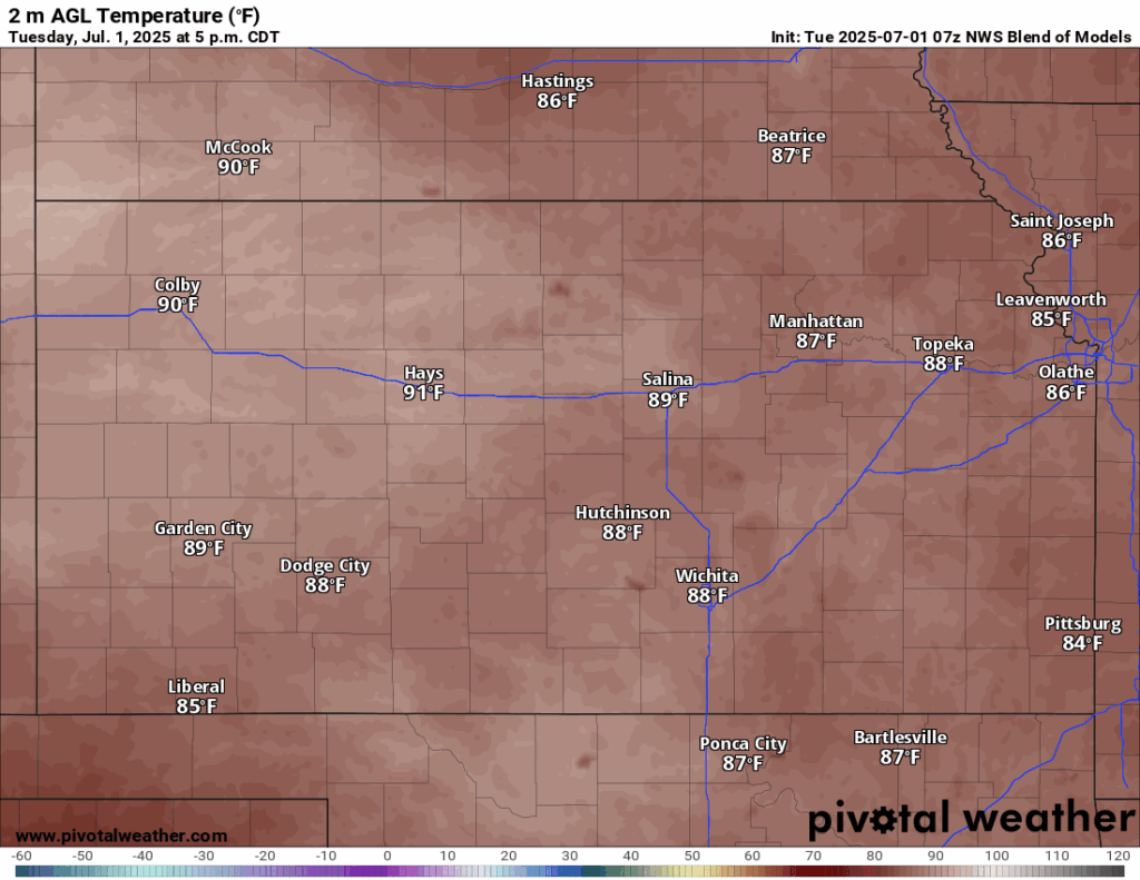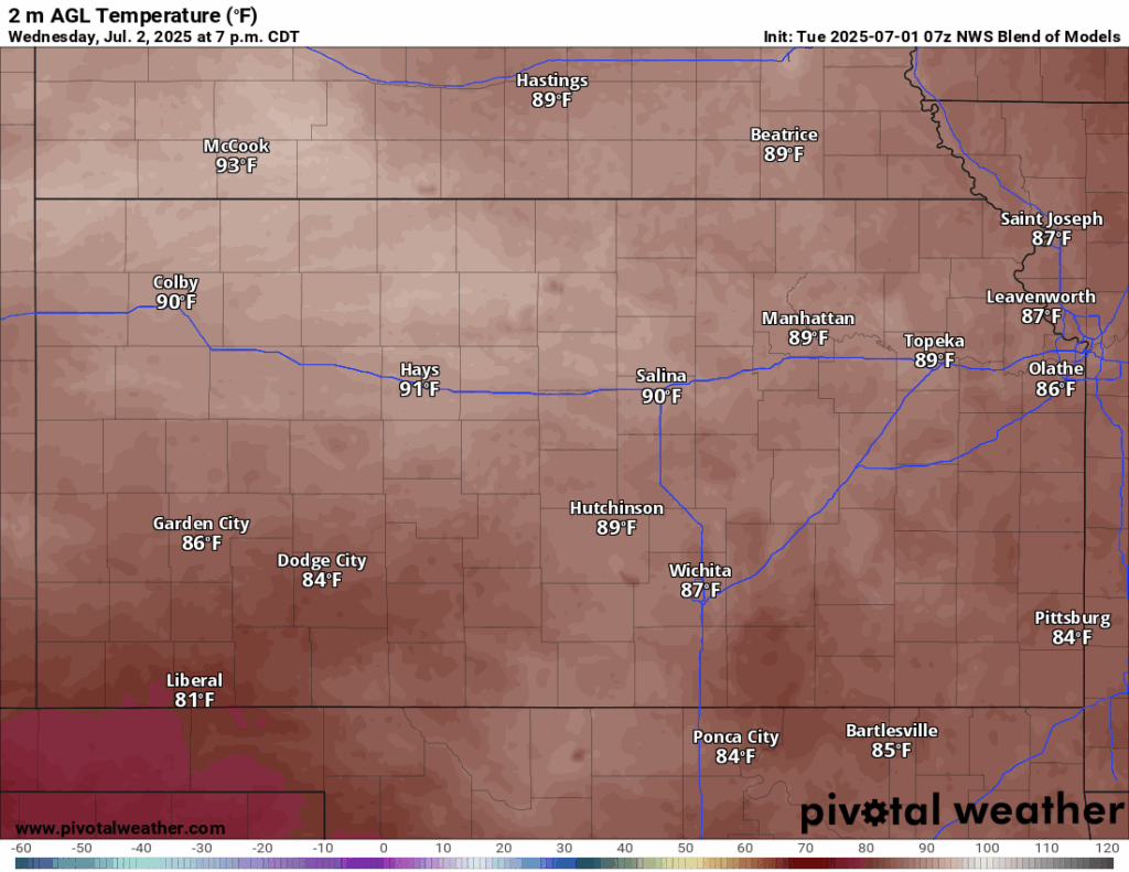 Thursday will see the return of southerly to southwesterly flow aloft, which will help pull the warm, humid air from the gulf northward and overspread Kansas once again. This will reintroduce chances for precipitation all the way through the weekend, albeit low chances currently. Temperatures during the long-term period will hover in the upper 80s to low 90s daily. This heat will start to feel like the hot, humid heat of the past couple of days as well with the reintroduction of gulf moisture, with our relative humidity values fluctuating between 55-65%. Current heat indices are projected to be in the low to mid 90s as a result.