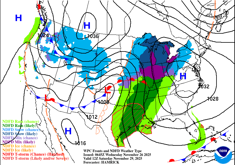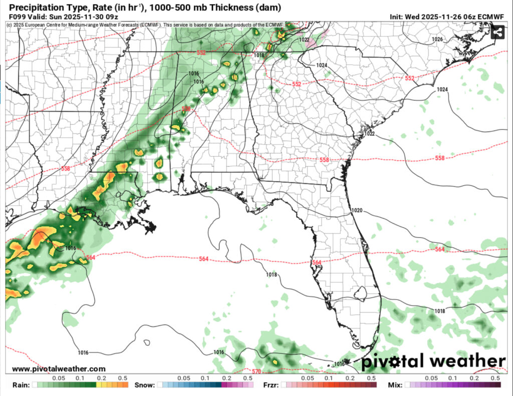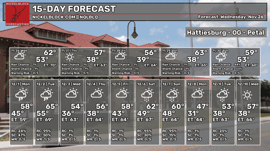 Black Friday will be another cool day with highs in the mid 50s during the day and increasing clouds. Overnight, we’ll fall into the low 30s again. Saturday we’ll have milder conditions as winds shift towards the southeast. Highs in the low 60s. As we move on towards the evening, rain chances will increase after midnight into the early morning. A few thunderstorms are possible, but this looks to be mainly a rain event.