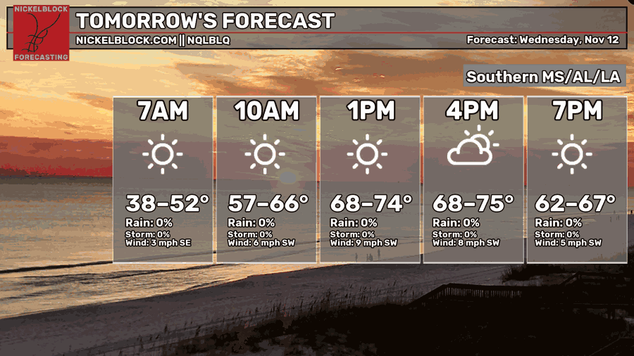 Again, we have one more night of frigid temperatures, maybe not as cold but temps will be in the upper 30s and lower 40s for most. We are free from any rain, and clouds at that, thanks to our area of high pressure.