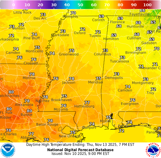 The morning temperatures on Thursday will be much milder than the previous ones, this time in the 50s. Temperatures become much warmer in the mid-to-upper 70s as that ridging slides its way eastward. Skies are partly cloudy with no chance for rain in the forecast.