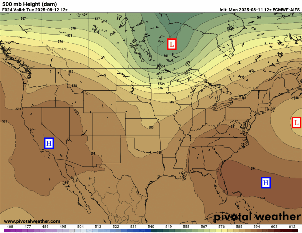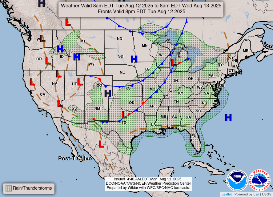 The mid-level (500 mb) pattern today features broad ridging across much of the country, with the exception of the northern tier where troughing is present due to a low pressure system moving through Canada. Despite the dominant ridge, there is still enough atmospheric lift and moisture, especially in the East, to support areas of rain. Most of today’s precipitation will occur near cold fronts or stationary boundaries, while parts of the Southeast are seeing showers and storms develop along a surface trough typical of summertime conditions.