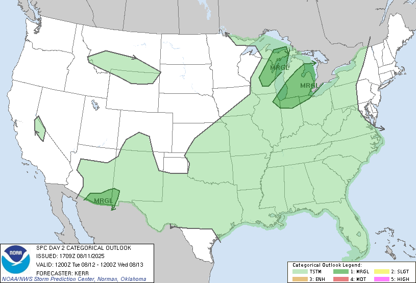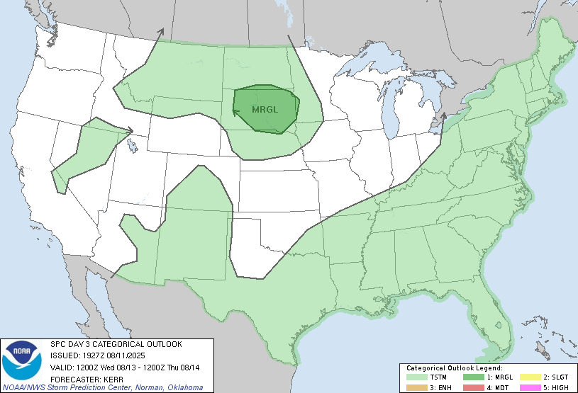 A Marginal (level 1/5) risk of severe weather is highlighted over South Dakota for tomorrow, Wednesday 8/13/25. Parts of central and eastern South Dakota could see a few strong to severe thunderstorms, mainly in the evening and at night. The main threat looks to be strong wind gusts, but some storms could become organized enough to produce more widespread severe weather. While details are still coming together, it’s possible that the severe risk could be upgraded in later forecasts.