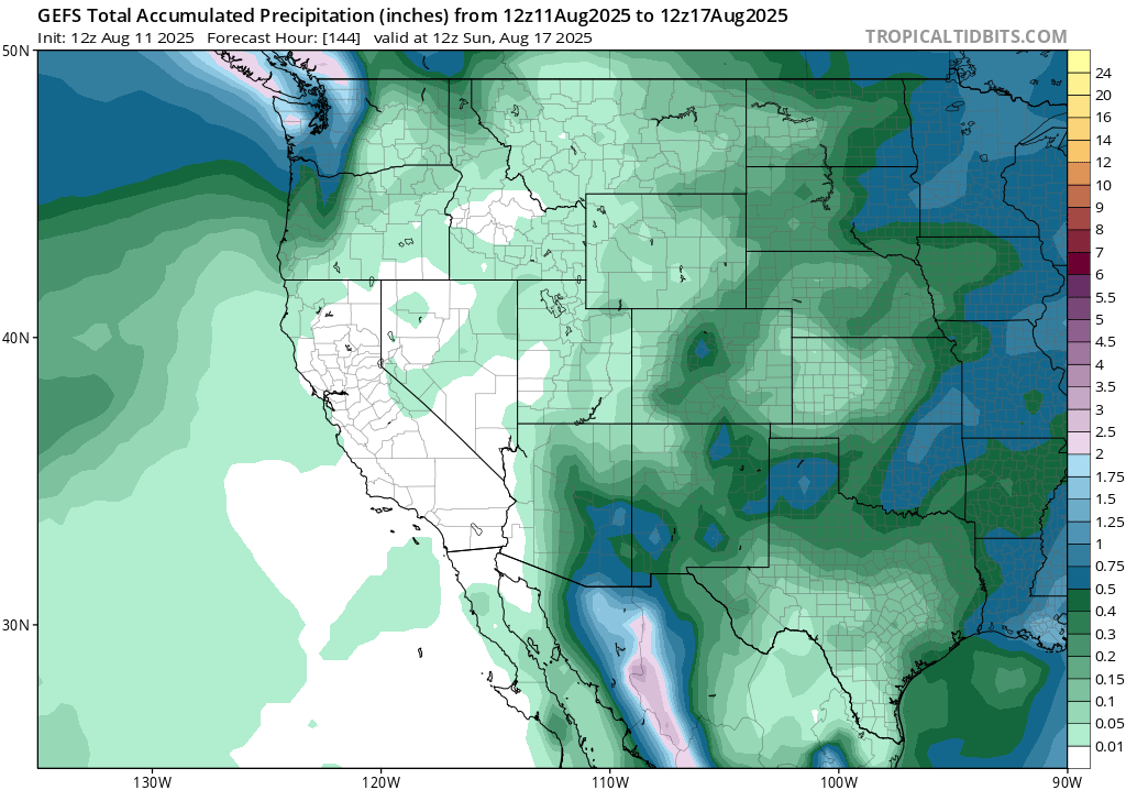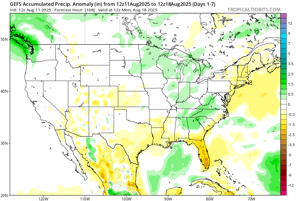 Here’s a look at the GEFS modeled precipitation anomalies through Monday 12z. Green indicates above average precipitation, white indicates average precipitation, and yellow indicates below average precipitation. Let’s look into the details by region: