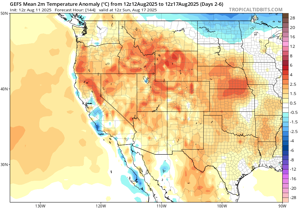 The heat is cranking in the west region this week, with some areas seeing up to 10 degree above the normal on average. Some areas near the coast are expected to see some cooler than normal temperatures. Near average, or slightly below average rainfall is expected for the week. California, as a whole, will see another week of bone dry conditions.